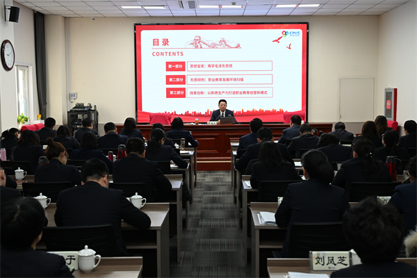 她指出要深入学习毛泽东思想,学习习近平新时代中国特色社会主义思想,坚持好、运用好贯穿其中的立场、观点、方法,围绕党的二十大提出的“六个必须坚持”,实施好“四坚持八引领”党建引领学校高质量发展体系,增强昌职干部的文化自信;要加强系统思考,从政治、经济、社会、科技等层面通盘考虑,推动职业教育与产业、与政府政策、与区域社会结构以及与终身学习的结合;要加强顶层设计,搭建好学校不同时期可持续发展的“四梁八柱”,巩固深化特高校形成的工作成果,继续擦亮昌职“十大品牌”;要开展创新行动,要进一步解放思想、先立后破、改革创新,以新质生产力打造经营的新模式;要促进组织发展,持续推进党组织领导的校长负责制改革,以高质量党建引领学校高质量发展,推动党建与业务工作深度融合;要促进个人发展,学校将通过制定干部队伍建设三年行动规划,落实名校长工作室等具体举措,打造一支学习型、服务型、研究型、创新型干部团队。
